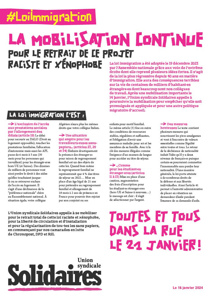 L’Union syndicale Solidaires appelle à se mobiliser pour le retrait total de cette loi raciste et xénophobe, pour la liberté de circulation et d’installation et pour la régularisation de tou-tes les sans papiers, en commençant par nos camarades en lutte de Chronopost, DPD et RSI.