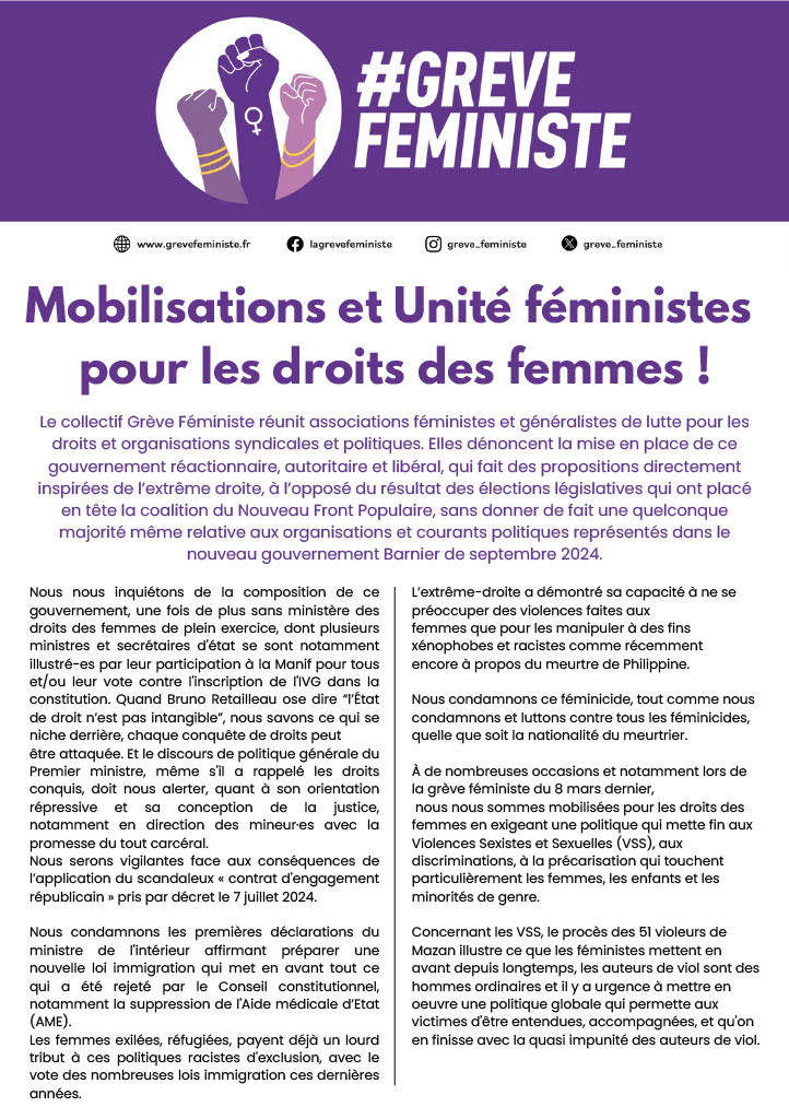 Le collectif Grève Féministe réunit associations féministes et généralistes de lutte pour les droits et organisations syndicales et politiques. Elles dénoncent la mise en place de ce gouvernement réactionnaire, autoritaire et libéral, qui fait des propositions directement inspirées de l’extrême droite, à l’opposé du résultat des élections législatives qui ont placé en tête la coalition du Nouveau Front Populaire, sans donner de fait une quelconque majorité même relative aux organisations et courants politiques représentés dans le nouveau gouvernement Barnier de septembre 2024.