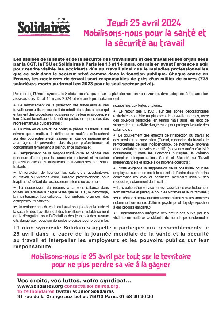 Pour cela, l’Union syndicale Solidaires s’appuie sur la plateforme forme revendicative adoptée à l’issue des assises des 13 et 14 mars 2024 et revendique notamment :