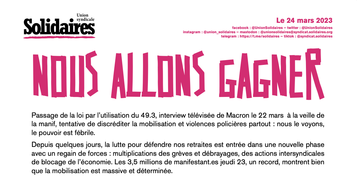Nous avons les moyens de gagner même après l’adoption du texte, comme cela a été le cas par exemple avec le CPE (Contrat Première Embauche). La colère contre la dégradation des conditions de travail et des niveaux de salaires depuis de nombreuses années -encore aggravés par l’inflation- renforce notre mobilisation. La priorité est de mettre en œuvre des politiques publiques pour la transformation sociale et écologique de la société.