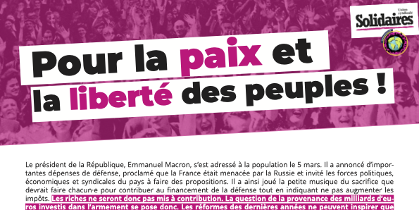 Le président de la République, Emmanuel Macron, s’est adressé à la population le 5 mars. Il a annoncé d’importantes dépenses de défense, proclamé que la France était menacée par la Russie et invité les forces politiques, économiques et syndicales du pays à faire des propositions. Il a ainsi joué la petite musique du sacrifice que devrait faire chacun·e pour contribuer au financement de la défense tout en indiquant ne pas augmenter les impôts. Les riches ne seront donc pas mis à contribution. La question de la provenance des milliards d’euros investis dans l’armement se pose donc. Les réformes des dernières années ne peuvent inspirer que la crainte. Les économies se sont systématiquement faites sur le dos des travailleurs et des travailleuses par la destruction des acquis sociaux et de notre modèle de protection sociale ou de nos services publics. Les industriels voient d’un très bon œil ces annonces qui sont la perspective d’un enrichissement faramineux. Ce n’est pas nouveau, pour les grands patrons, lorsque la croissance ralentit, rien de tel qu’une bonne guerre en perspective pour relancer la production ! Sans compter que le marché est juteux : lorsqu’un obus a explosé, il faut en racheter un autre.
