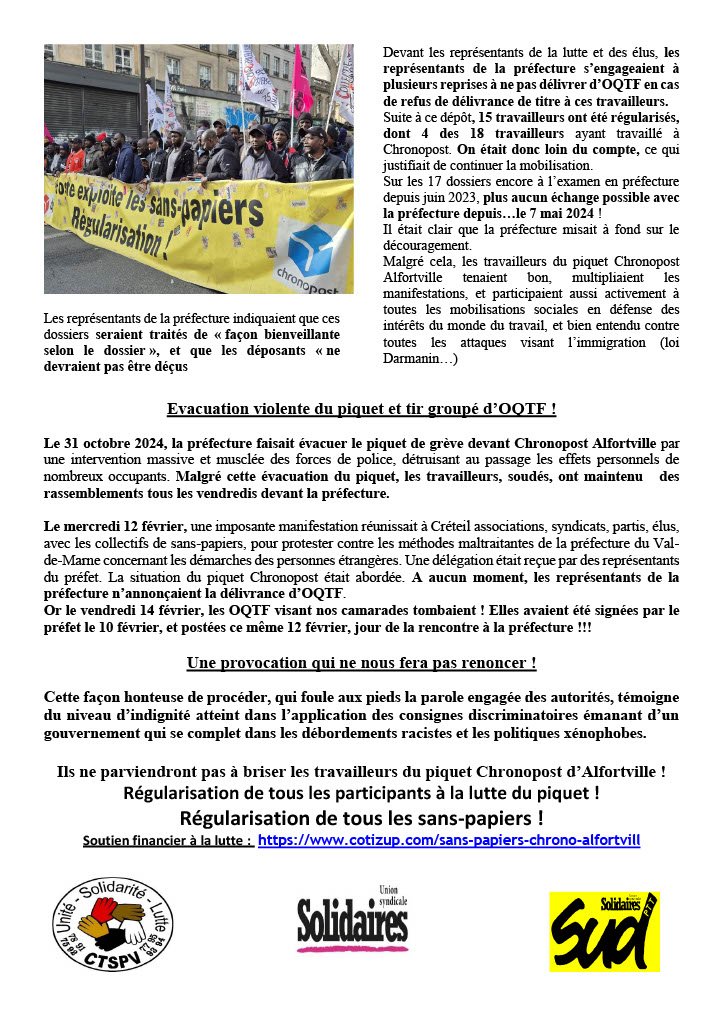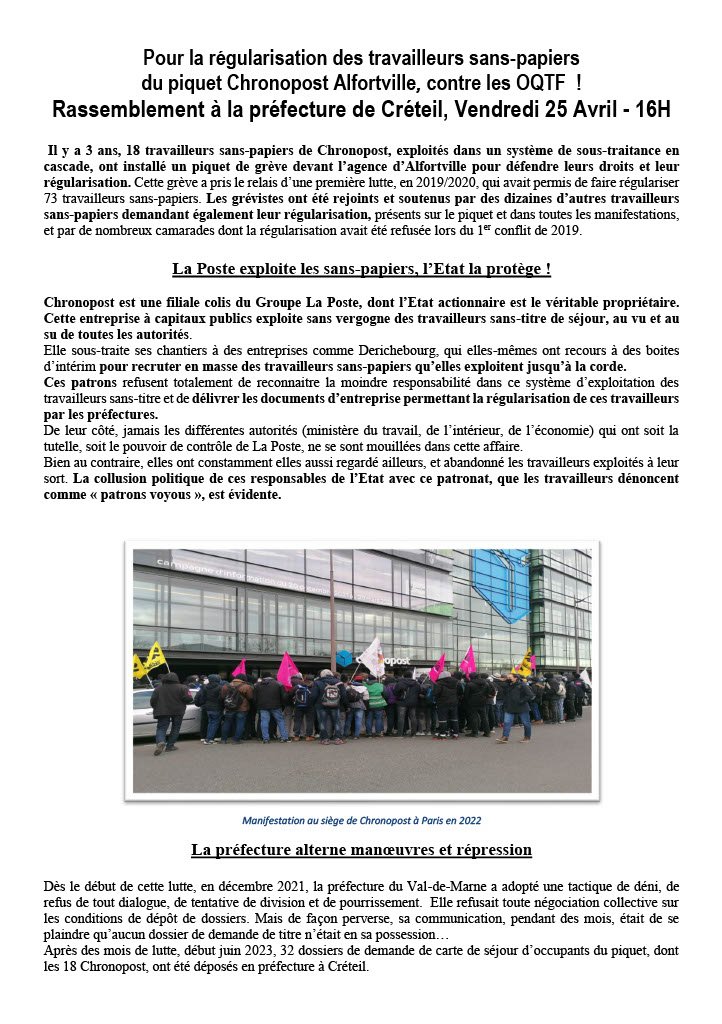 Pour la régularisation des travailleurs sans-papiers du piquet Chronopost Alfortville, contre les OQTF ! Rassemblement à la préfecture de Créteil, Vendredi 25 Avril - 16H