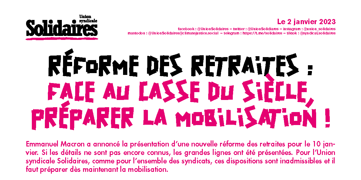 Solidaires invite à se réunir dès maintenant en assemblées générales, heures d’information syndicales, réunions… pour discuter entre collègues de cette réforme et se préparer à riposter.