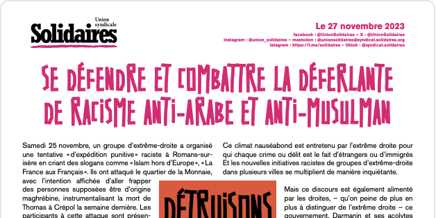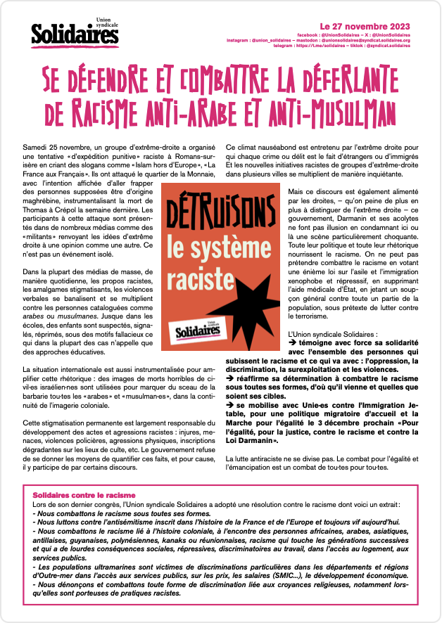 Lors de son dernier congrès, l’Union syndicale Solidaires a adopté une résolution contre le racisme dont voici un extrait :