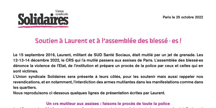 Le 15 septembre 2016, Laurent, militant de SUD Santé Sociaux, était mutilé par un jet de grenade. Les 12-13-14 décembre 2022, le CRS qui l'a mutilé passera aux assises de Paris. L'assemblée des blessé∙es dénonce la violence de l'Etat, de l'institution et prépare un procès de la police par ceux et celles qui en sont victimes.