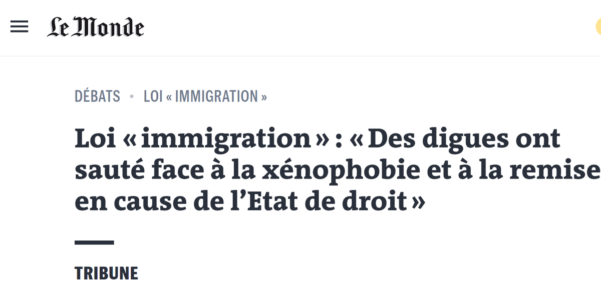 Tribune parue dans Le Monde le 15 février 2024 à lire ici : https://www.lemonde.fr/idees/article/2024/02/15/loi-immigration-des-digues-ont-saute-face-a-la-xenophobie-et-a-la-remise-en-cause-de-l-etat-de-droit_6216711_3232.html