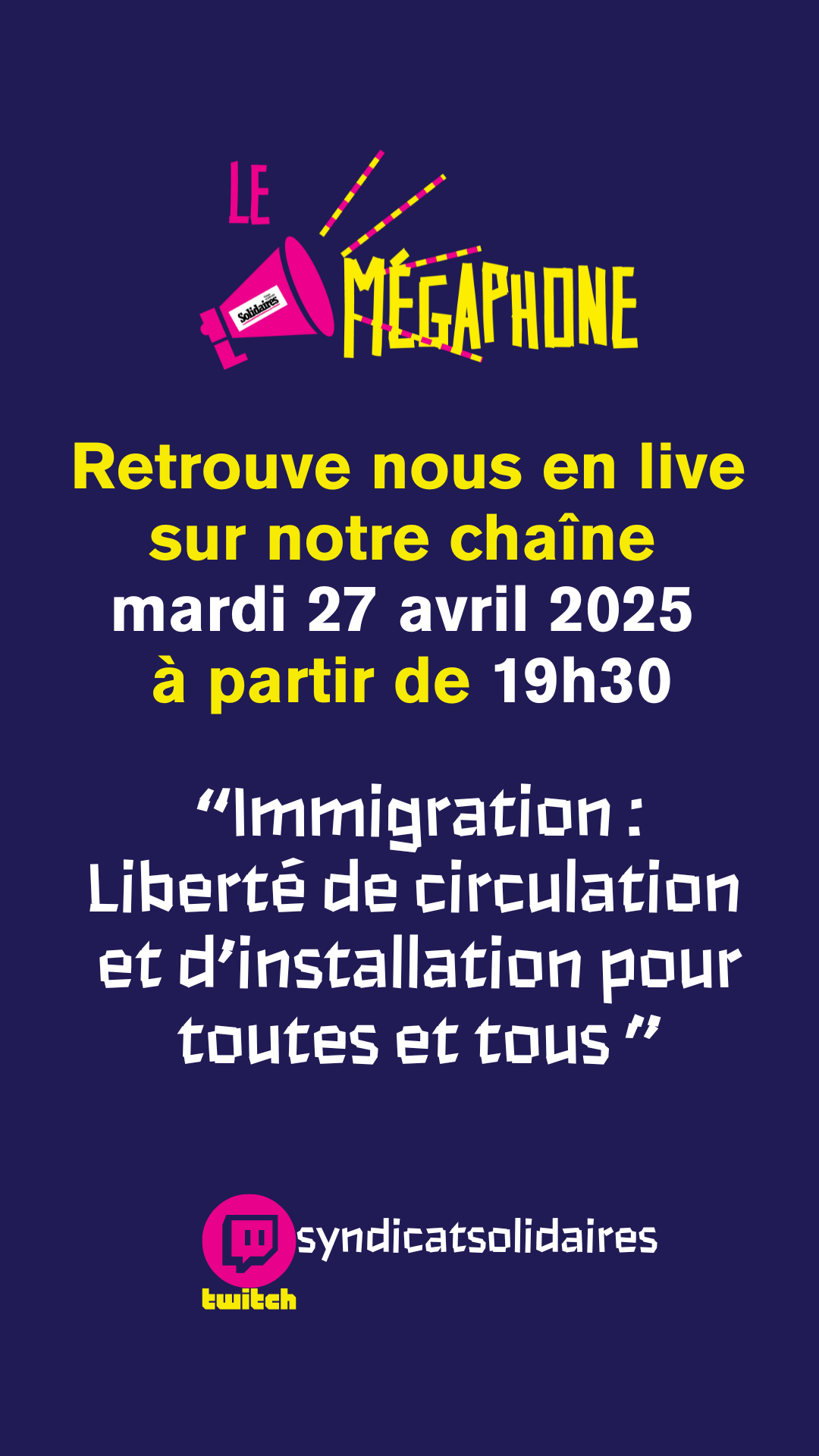 La prochaine émission du Mégaphone aura lieu sur la chaine Twitch de l'Union syndicale Solidaires le mardi 27 mai.