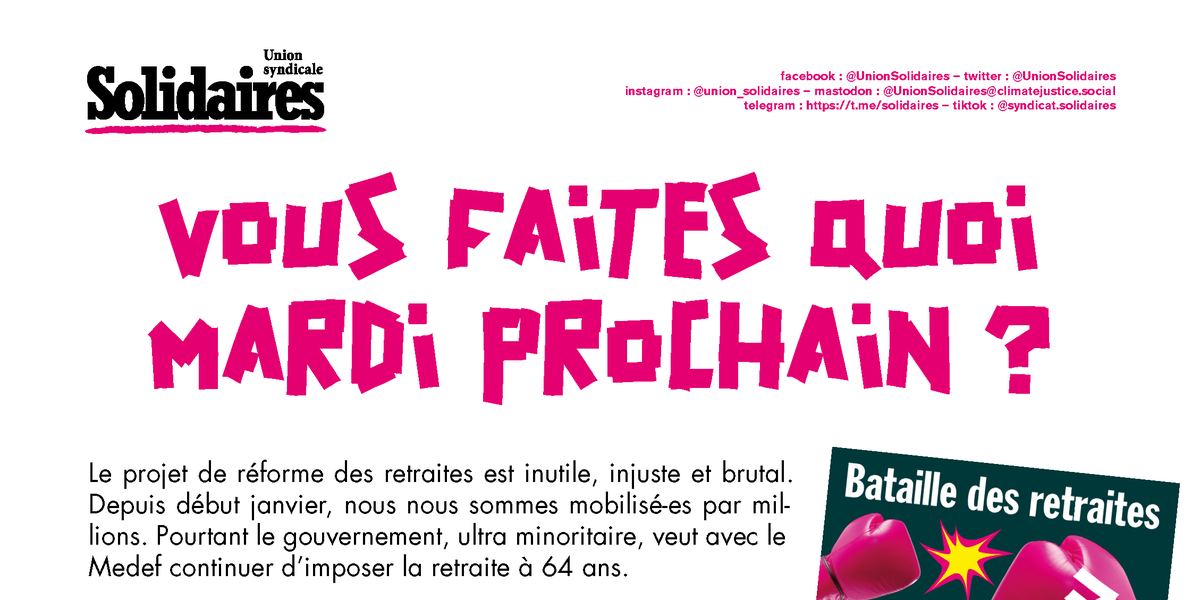 Le projet de réforme des retraites est inutile, injuste et brutal. Depuis début janvier, nous nous sommes mobilisé-es par millions. Pourtant le gouvernement, ultra minoritaire, veut avec le Medef continuer d’imposer la retraite à 64 ans.