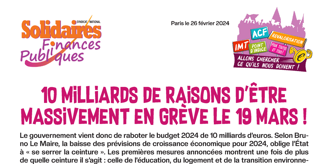 L’austérité qui vient nous donne 10 milliards de raisons supplémentaires d’être en grève le 19 mars, pour la journée de grève intersyndicale Fonction publique. Exigeons une juste et légitime revalorisation de notre rémunération basée sur une augmentation significative du point d’indice, la revalorisation de nos carrières et de notre régime indemnitaire.