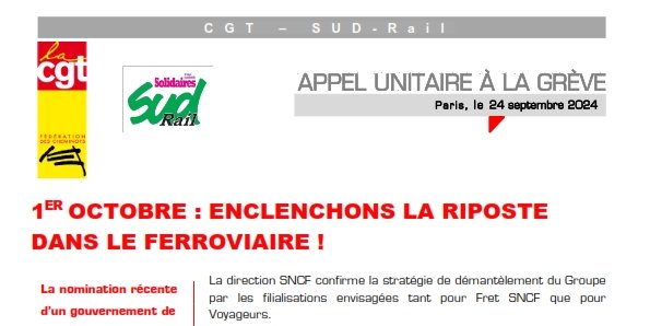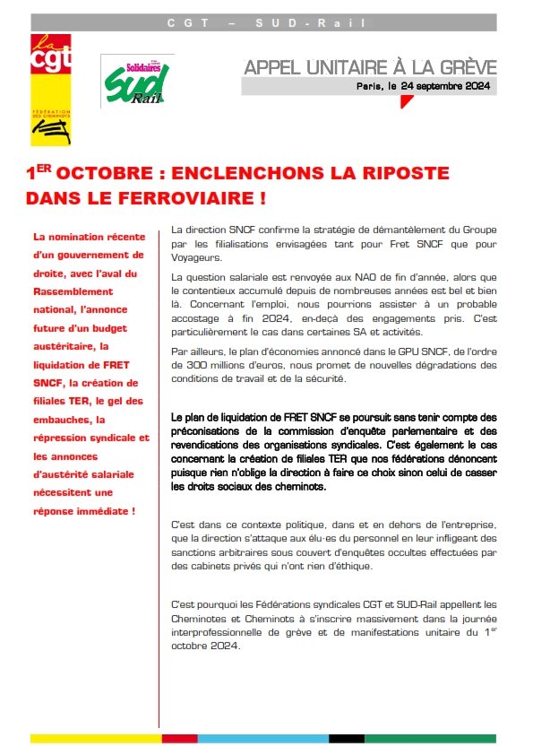 Les Fédérations syndicales CGT et SUD-Rail appellent les Cheminotes et Cheminots à s’inscrire massivement dans la journée interprofessionnelle de grève et de manifestations unitaire du 1er octobre 2024.
