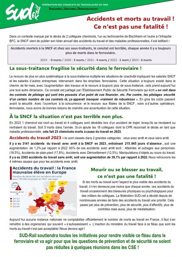 Dans un contexte marqué par le décès de 2 collègues cheminots, l’un au technicentre de Bischheim et l’autre à l’Infrapôle de Bourgogne Franche-Comté, la SNCF vient de publier son bilan annuel des accidents du travail et des maladies professionnelles, il est édifiant !