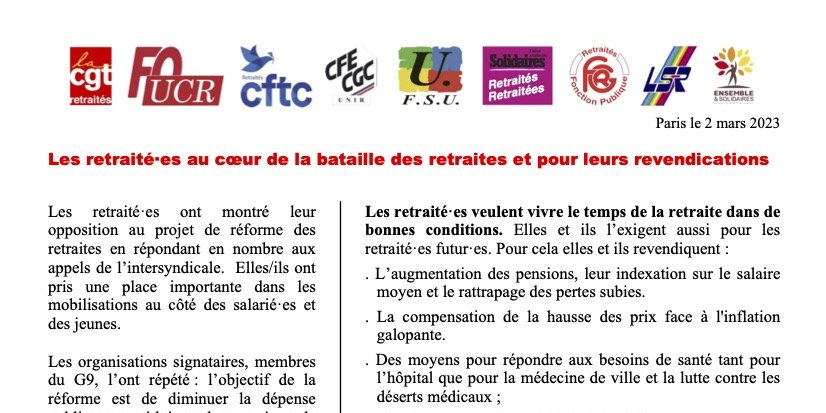 Les organisations signataires, membres du G9, l’ont répété : l’objectif de la réforme est de diminuer la dépense publique en réduisant les pensions de retraite actuelles et futures et de poursuivre la casse du modèle social français sur fond de déni de démocratie et de mensonges. Obliger les gens à rester encore plus longtemps au travail au prix du sacrifice de leurs meilleures années de retraite, constitue une violence sociale inouïe qu’il est légitime de rejeter.