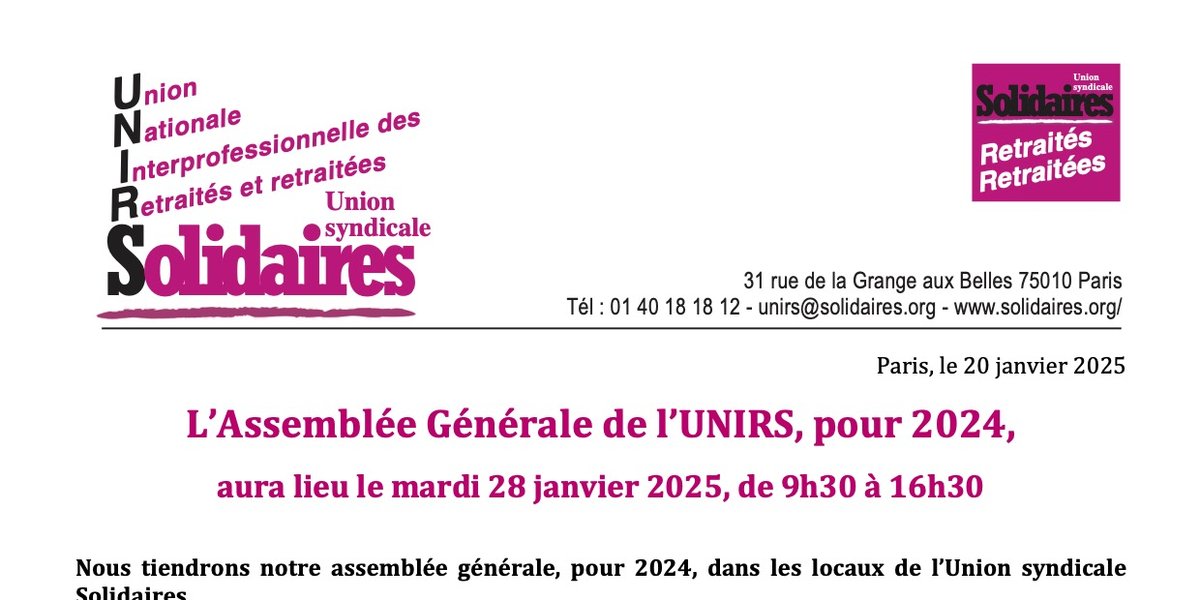 Attention, cette Assemblée Générale 2024 de l'Unirs était prévue le 11 décembre 2024 (jour du début de la grève reconductible à la SNCF), elle a été reportée au 28 janvier 2025. Voici l'ordre du jour avec la nouvelle feuille d'inscription, ainsi que les textes qui seront discutés et votés :