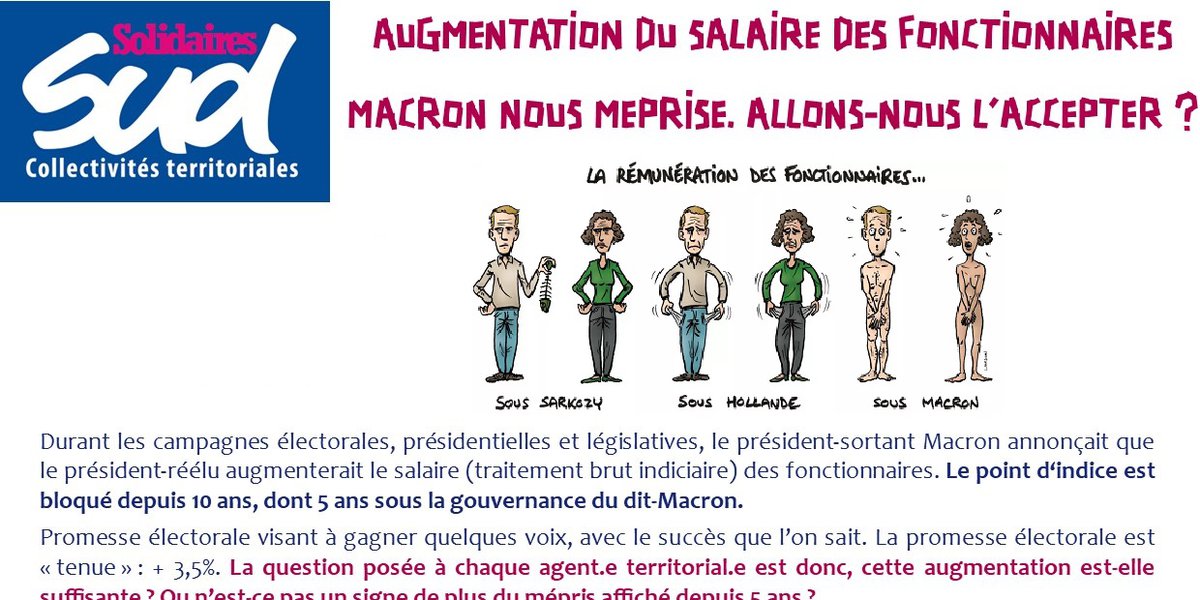 Durant les campagnes électorales, présidentielles et législatives, le président-sortant Macron annonçait que le président-réélu augmenterait le salaire (traitement brut indiciaire) des fonctionnaires. Le point d‘indice est bloqué depuis 10 ans, dont 5 ans sous la gouvernance du dit-Macron.