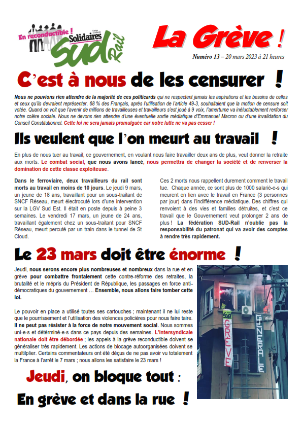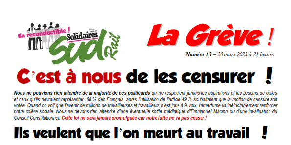 Nous ne pouvions rien attendre de la majorité de ces politicards qui ne respectent jamais les aspirations et les besoins de celles et ceux qu’ils devraient représenter. 68 % des Français, après l’utilisation de l’article 49-3, souhaitaient que la motion de censure soit votée. Quand on voit que l’avenir de millions de travailleuses et travailleurs s’est joué à 9 voix, l’amertume va inéluctablement renforcer notre colère sociale. Nous ne devons rien attendre d’une éventuelle sortie médiatique d’Emmanuel Macron ou d’une invalidation du Conseil Constitutionnel. Cette loi ne sera jamais promulguée car notre lutte ne va pas cesser !