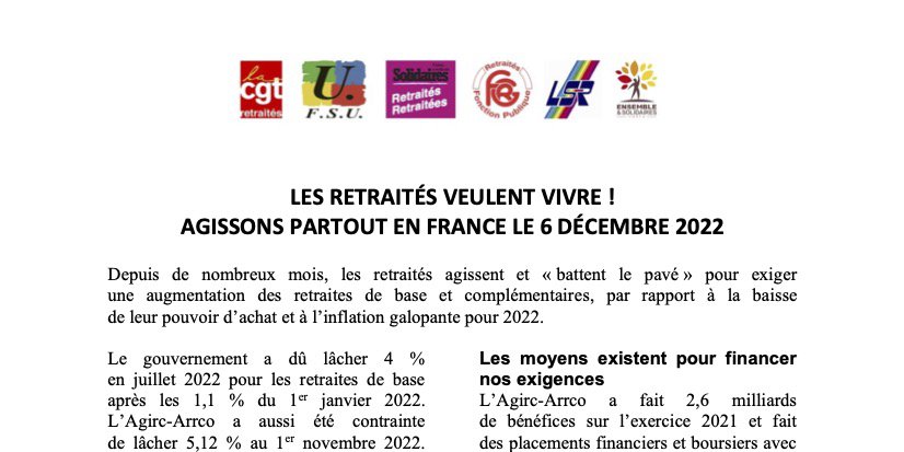 Au-delà des exigences en termes de rattrapage de pouvoir d’achat, les 6 organisations de retraités CGT, FSU, UNIRS-Solidaires, FGR-FP, Ensemble & Solidaires et LSR revendiquent l’indexation des pensions sur le salaire moyen, une pension au minimum au SMIC, et une retraite à 60 ans, avec un système par répartition solidaire.