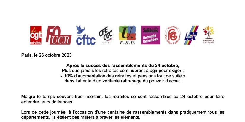 - Invitent toutes celles et tous ceux qui ne l’ont pas encore fait à signer la pétition exigeant 10% d’augmentation de nos pensions et retraites tout de suite, pétition qui a déjà recueillie plus de 64 000 signatures.