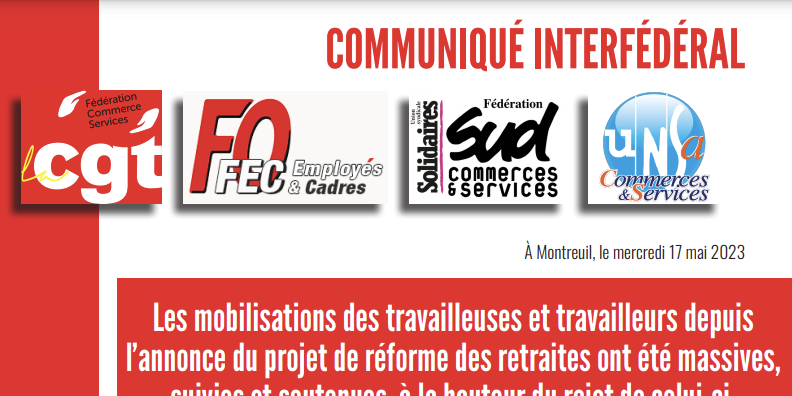 Parce que les secteurs du commerce et services sont sévèrement impactés par le recul du pouvoir d’achat, par les bas salaires qui entraineront de fait de basses pensions de retraite, par des conditions de travail pénible, par des horaires décalés, l’expression de la colère doit se traduire par la multiplication d’actions, de mobilisations, de grève qui devront ponctuer tout ce mois de mai et au-delà du 6 juin si cette loi n’est pas retirée.