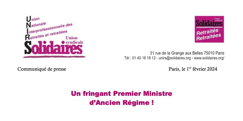 L’Union Nationale Interprofessionnelle des Retraitées et Retraités Solidaires (UNIRS) constate par ailleurs que ce fringant jeune homme n’a eu aucun mot pour les personnes retraitées, rien pour les personnes âgées qui ont des très petites retraites, rien pour améliorer la situation des personnes qui survivent difficilement avec les minima sociaux. Nous n’avons vu aucune annonce quant à l’amélioration des services de santé et des conditions de travail et de rémunération de leurs personnels, rien pour améliorer la situation de l’hôpital public, rien de concret pour renforcer les services d’aide à domicile et améliorer leur accessibilité ni pour renforcer les EHPAD publics et pour éviter les abus, maltraitances et autres scandales récemment dévoilés. Nous avons seulement noté l’annonce « avant l’été ... d’un projet de loi sur l’aide active à mourir dans notre pays » ... faute de bien vieillir.