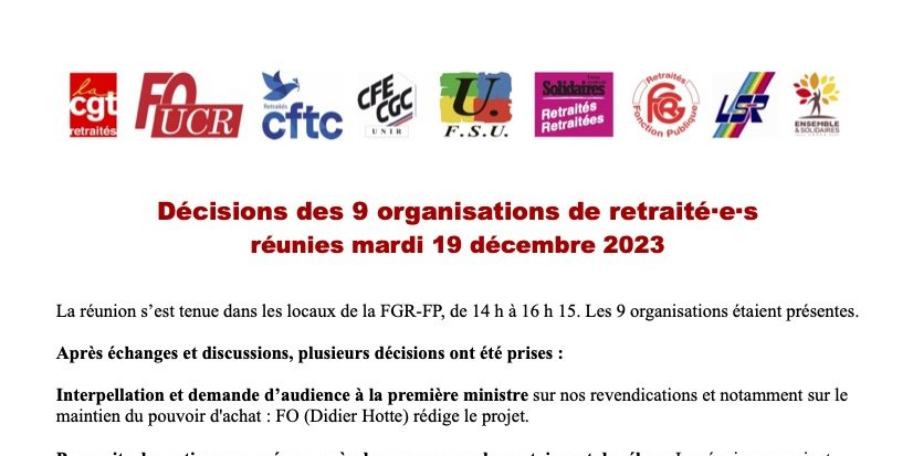 Prochaine réunion : vendredi 19 janvier 2024 à 10 h dans les locaux de FO.