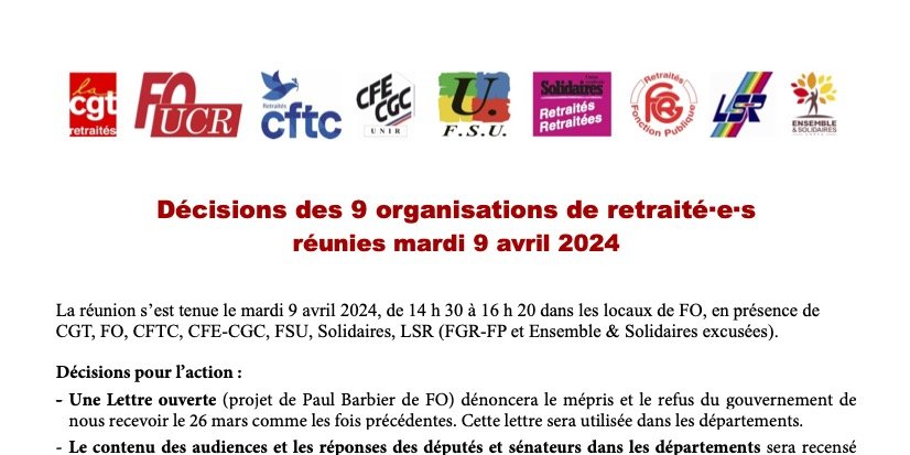 La réunion s’est tenue le mardi 9 avril 2024, de 14 h 30 à 16 h 20 dans les locaux de FO, en présence de CGT, FO, CFTC, CFE-CGC, FSU, Solidaires, LSR (FGR-FP et Ensemble & Solidaires excusées).