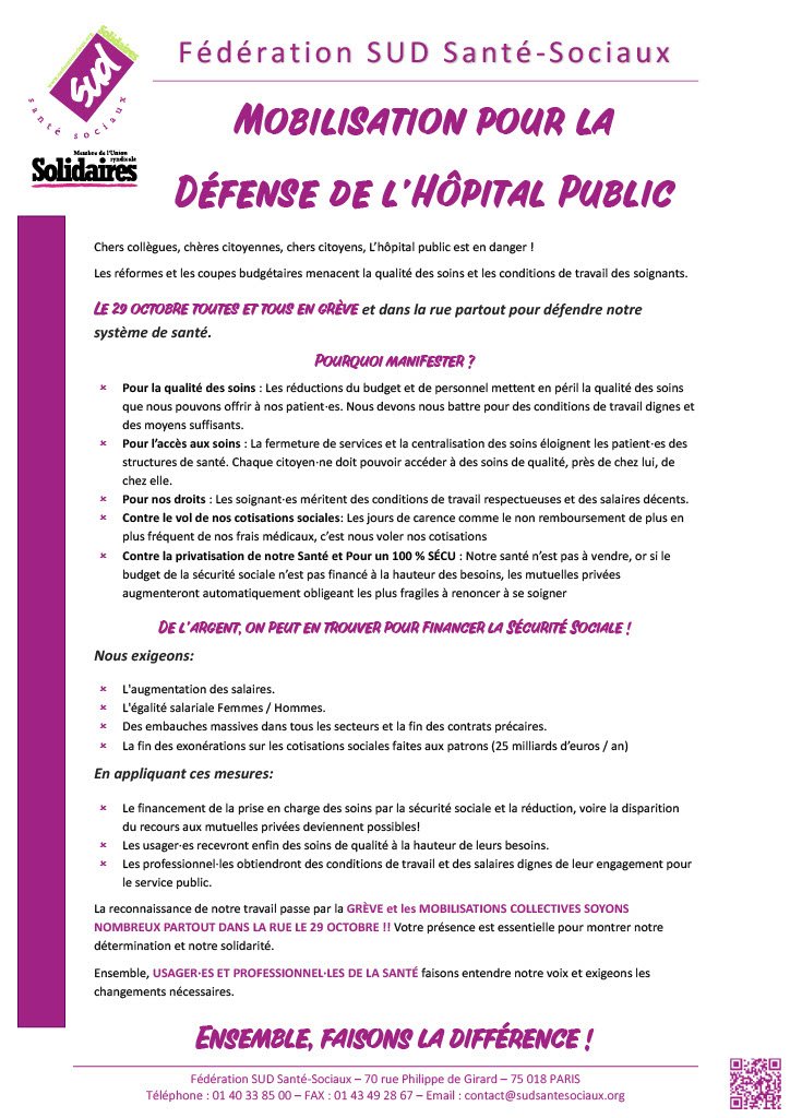 Le 29 octobre toutes et tous en grève et dans la rue partout pour défendre notre système de santé.