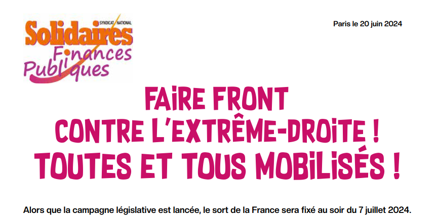 Alors que la campagne législative est lancée, le sort de la France sera fixé au soir du 7 juillet 2024. Dans cette période où l’extrême-droite pourrait gouverner le pays, Solidaires Finances Publiques prend ses responsabilités en tant que syndicat indépendant mais cependant ni neutre ni indifférent.