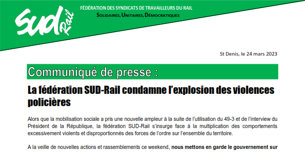 Alors que la mobilisation sociale a pris une nouvelle ampleur à la suite de l’utilisation du 49-3 et de l’interview du Président de la République, la fédération SUD-Rail s’insurge face à la multiplication des comportements excessivement violents et disproportionnés des forces de l’ordre sur l’ensemble du territoire.