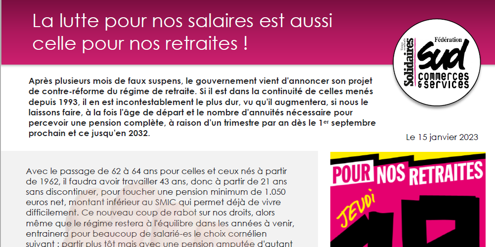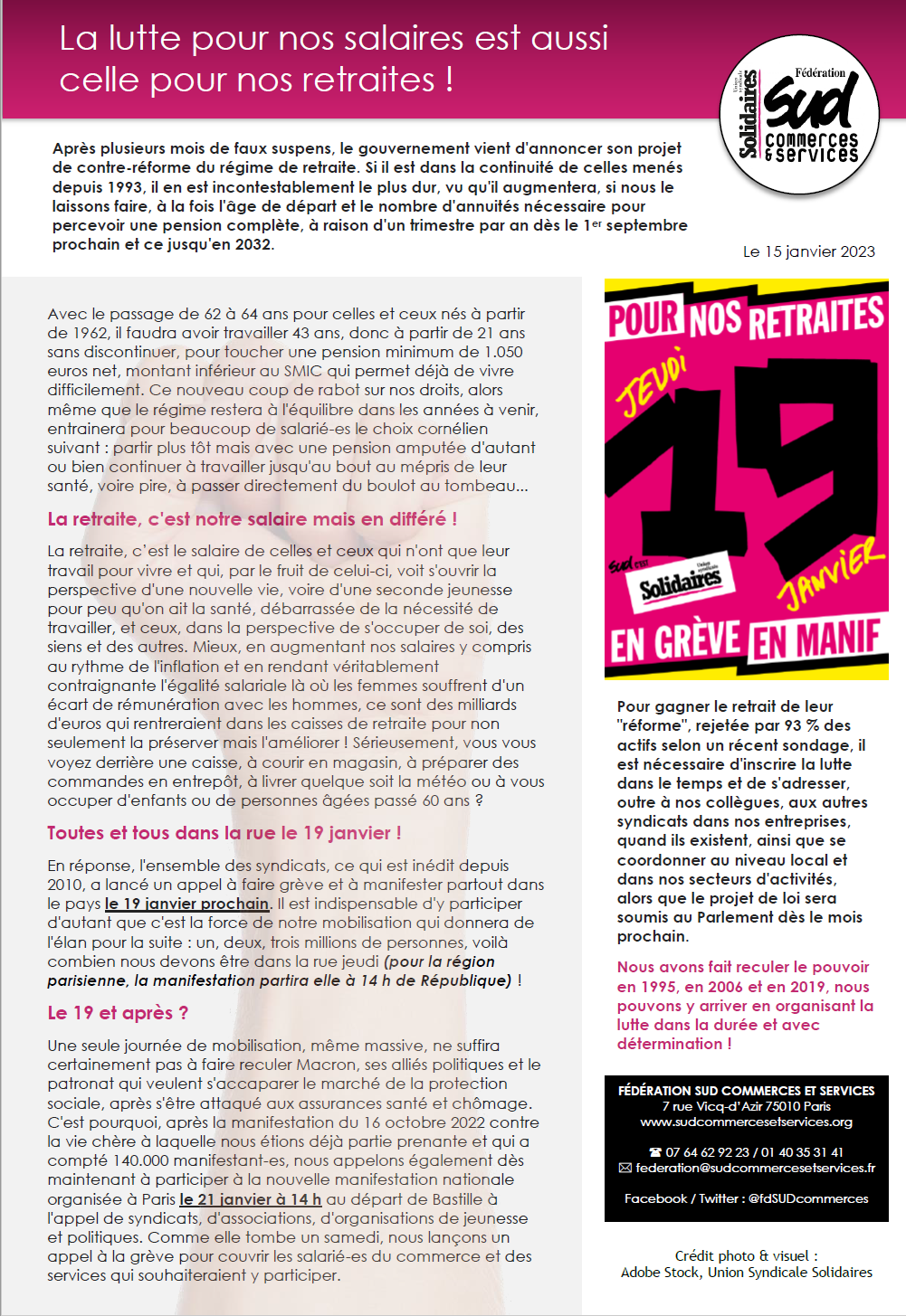 Une seule journée de mobilisation, même massive, ne suffira certainement pas à faire reculer Macron, ses alliés politiques et le patronat qui veulent s'accaparer le marché de la protection sociale, après s'être attaqué aux assurances santé et chômage. C'est pourquoi, après la manifestation du 16 octobre 2022 contre la vie chère à laquelle nous étions déjà partie prenante et qui a compté 140.000 manifestant-es, nous appelons également dès maintenant à participer à la nouvelle manifestation nationale organisée à Paris le 21 janvier à 14 h au départ de Bastille à l'appel de syndicats, d'associations, d'organisations de jeunesse et politiques. Comme elle tombe un samedi, nous lançons un appel à la grève pour couvrir les salarié-es du commerce et des services qui souhaiteraient y participer.