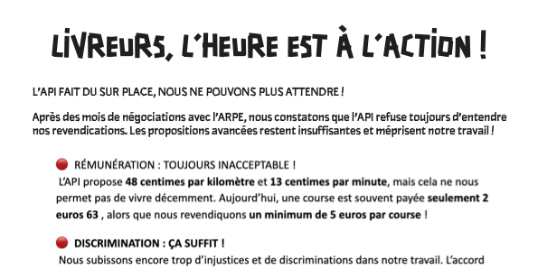 L’API propose 48 centimes par kilomètre et 13 centimes par minute, mais cela ne nous permet pas de vivre décemment. Aujourd’hui, une course est souvent payée seulement 2 euros 63 , alors que nous revendiquons un minimum de 5 euros par course !