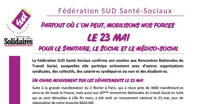 La Fédération SUD Santé Sociaux se joint à cet appel et invite tous les syndicats départementaux à s’organiser et relayer cette nouvelle date revendicative pour que cet appel soit le plus largement suivi par les salarié·es et les agent·es qui souhaitent faire de ce jour une tribune pour se faire entendre et faire comprendre au gouvernement que nous sommes toujours déterminé·es à faire perdurer nos métiers dans des conditions décentes et des salaires tout aussi décents.