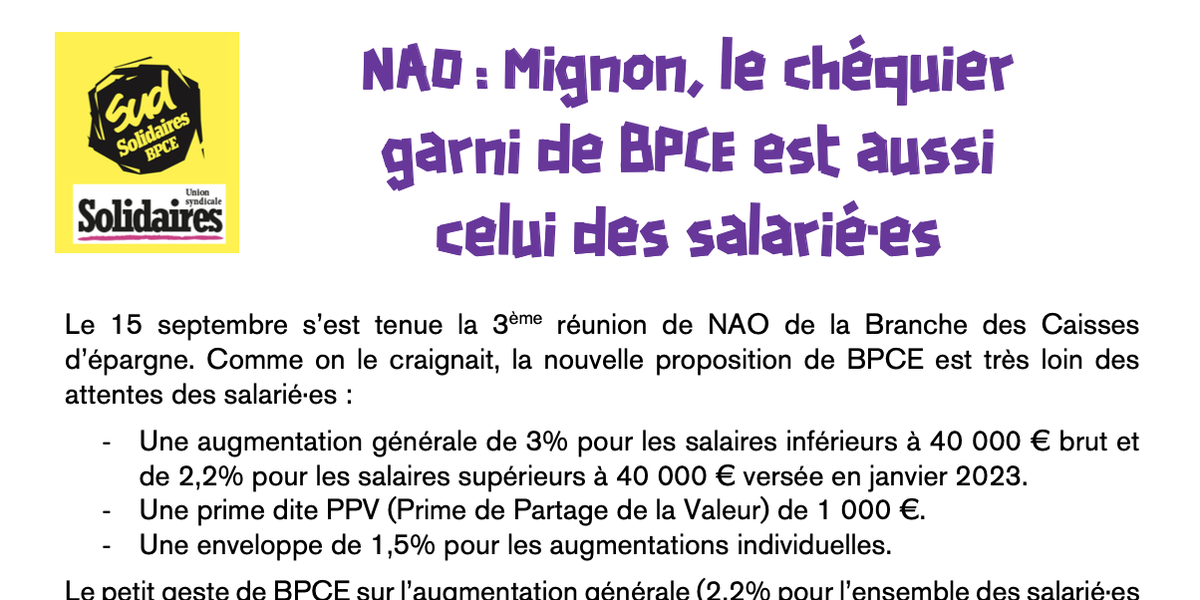 Le 15 septembre s’est tenue la 3ème réunion de NAO de la Branche des Caisses d’épargne. Comme on le craignait, la nouvelle proposition de BPCE est très loin des attentes des salarié·es :