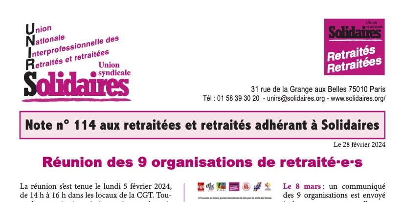 Le 8 mars : un communiqué des 9 organisations est envoyé à la presse et un colloque, notamment en défense de la pension de réversion menacée se tiendra à Paris le 4 mars à partir de 14 h à la Bourse du travail 3 rue du Château d’eau à Paris (voir l’invitation ici : https://solidaires.org/sinformer-et-agir/actualites-et-mobilisations/sectorielles/8-mars-2024-lexigence-degalite-pour-les-femmes-retraitees-aussi-tract-des-9-organisations-de-retraitees/)