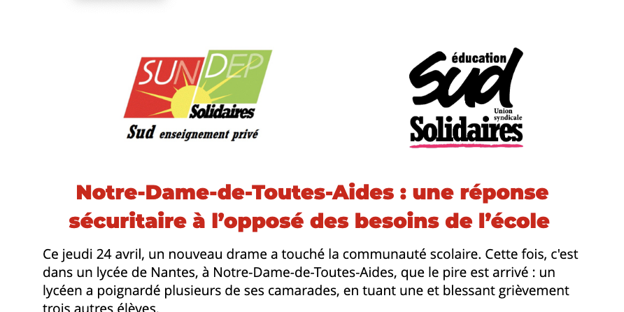SUD éducation et le Sundep Solidaires Sud enseignement privé assurent leur pleine et entière solidarité aux élèves, aux familles, aux proches et aux personnels de l’établissement confronté·es à ces événements traumatisants. Ce drame est d’abord un drame humain. Il mérite toute notre attention et notre considération syndicale.