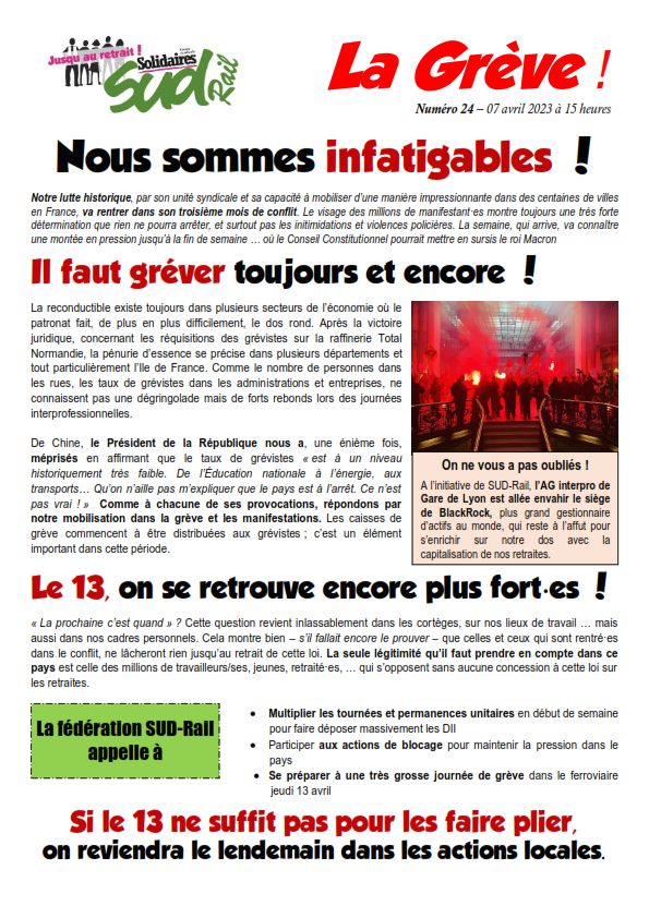 Notre lutte historique, par son unité syndicale et sa capacité à mobiliser d’une manière impressionnante dans des centaines de villes en France, va rentrer dans son troisième mois de conflit. Le visage des millions de manifestant·es montre toujours une très forte détermination que rien ne pourra arrêter, et surtout pas les initimidations et violences policières. La semaine, qui arrive, va connaître une montée en pression jusqu’à la fin de semaine … où le Conseil Constitutionnel pourrait mettre en sursis le roi Macron