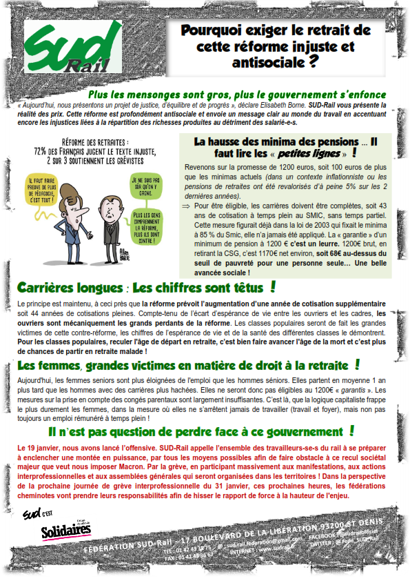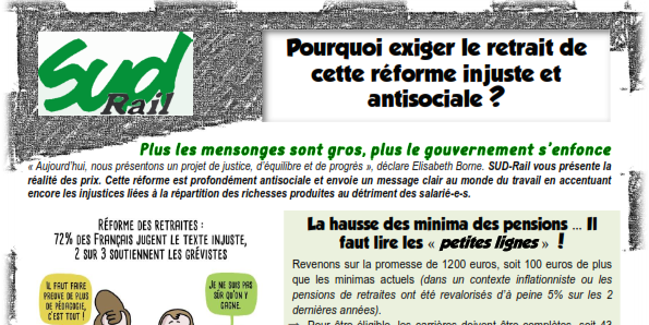 « Aujourd’hui, nous présentons un projet de justice, d’équilibre et de progrès », déclare Elisabeth Borne. SUD-Rail vous présente la réalité des prix. Cette réforme est profondément antisociale et envoie un message clair au monde du travail en accentuant encore les injustices liées à la répartition des richesses produites au détriment des salarié-e-s.
