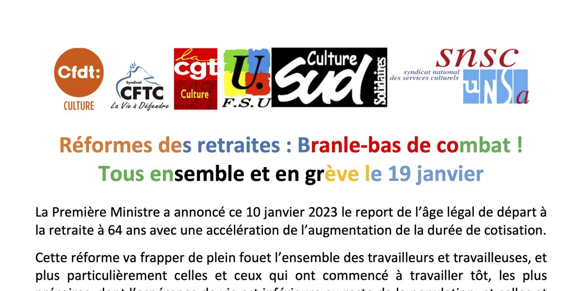 Suite à l’annonce de la réforme gouvernementale, nos organisations syndicales se sont réunies pour participer à la construction d’une réponse commune de mobilisation des personnels au ministère de la Culture. Celle-ci prendra la forme d’une première journée de grèves et de manifestations le 19 janvier 2023, journée unitaire proposée