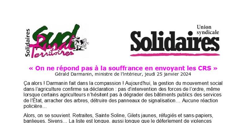 Ça alors ! Darmanin fait dans la compassion ! Aujourd’hui, la gestion du mouvement social dans l’agriculture confirme sa déclaration : pas d’intervention des forces de l’ordre, même lorsque certains agriculteurs n’hésitent pas à dégrader des bâtiments publics des services de l’État, arracher des arbres, détruire des panneaux de signalisation… Aucune réaction policière…