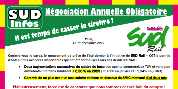 Il parait indispensable pour SUD Rail qu’une juste récompense de l’engagement et des efforts fournis par tous les salariés se traduise par une revalorisation significative des grilles salariales, toutes catégories confondues (employés, maitrises, et cadres) lors de ces prochaines négociations NAO !