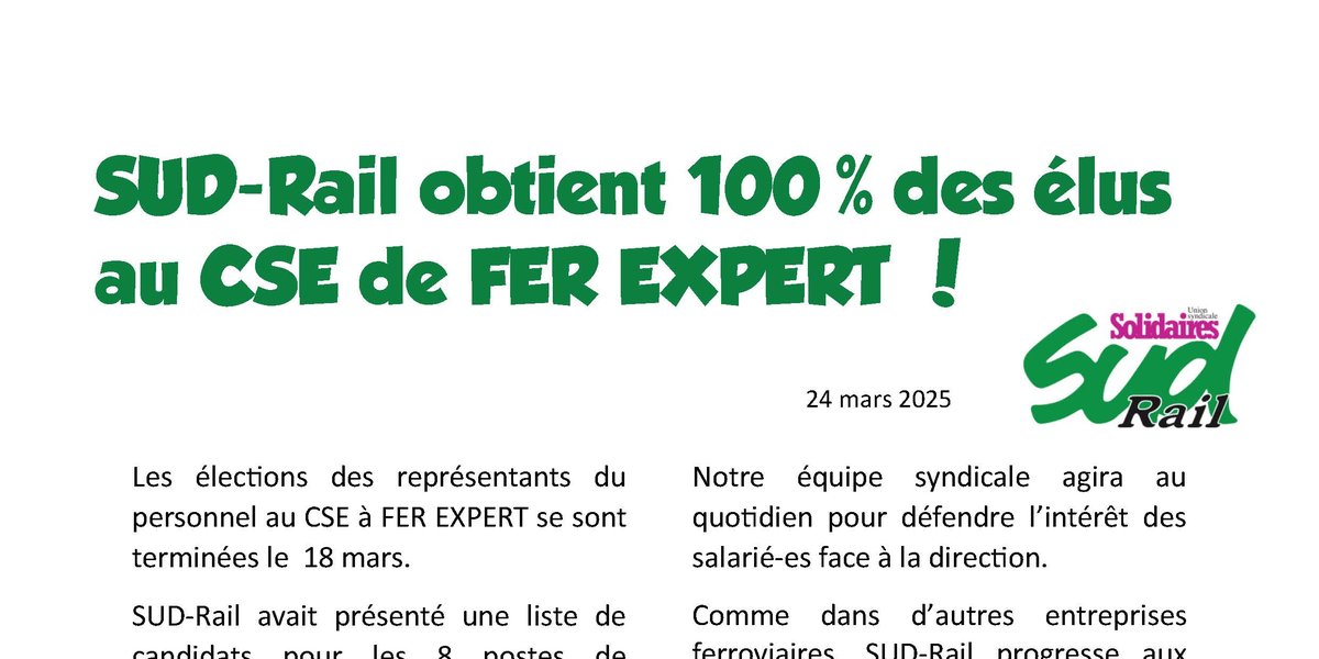 SUD-Rail avait présenté une liste de candidat·es pour les 8 postes de délégués titulaires et suppléants. Tous/tes nos candidat·es ont été élus et SUD-Rail est également devenu représentaif dans l’entreprise