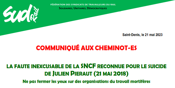 5 ans après les faits, le Tribunal Judiciaire de Saint-Quentin, dans un jugement du 15 mai, précis, détaillé et sensible, a reconnu la faute inexcusable de la SNCF, pour la mort par suicide de Julien Piéraut, survenue le 21 mai 2018, en plein conflit contre la énième réforme du système ferroviaire, qui éclatait un peu plus la SNCF, et promettait toujours plus de pression sur les travailleur-euses au nom de la productivité et de la rentabilité.