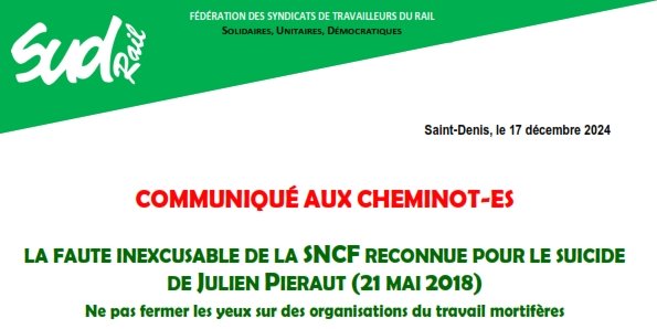 Dans un arrêt du 10 décembre 2024 la Cour d’Appel d’Amiens a confirmé la décision du Tribunal Judiciaire de Saint-Quentin du 15 mai 2023, reconnaissant la faute inexcusable de la SNCF pour la mort par suicide de Julien Piéraut, survenue le 21 mai 2018, en plein conflit contre la énième réforme du système ferroviaire, qui éclatait un peu plus la SNCF, et promettait toujours plus de pression sur les travailleur-euses au nom de la productivité et de la rentabilité.