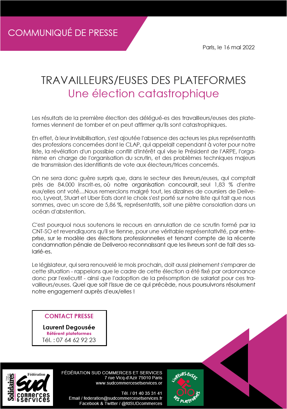 On ne sera donc guère surpris que, dans le secteur des livreurs/euses, qui comptait près de 84.000 inscrit-es, où notre organisation concourait, seul 1,83 % d'entre eux/elles ont voté…Nous remercions malgré tout, les dizaines de coursiers de Deliveroo, Lyveat, Stuart et Uber Eats dont le choix s'est porté sur notre liste qui fait que nous sommes, avec un score de 5,86 %, représentatifs, soit une piètre consolation dans un océan d'abstention.