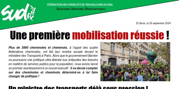 Dans le ferroviaire, ces prochaines semaines nous allons mener des luttes sociales pour augmenter nos salaires, sauver Fret SNCF et les emplois de nos collègues, combattre le dumping social dans le cadre de l’ouverture à la concurrence TER , stopper la répression antisyndicale … Dans plusieurs secteurs et administrations, les appels à la grève pour le 1er octobre se multiplient et sont souvent unitaires : Education, Industrie, Culture, Fonction Publique, Transports … Faisons monter notre colère et le rapport de forces dans le ferroviaire dès la semaine prochaine.