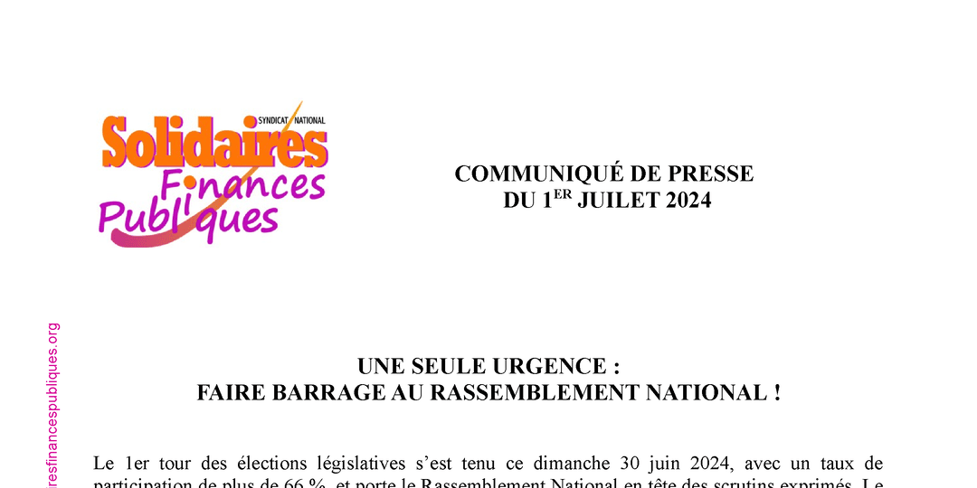 Solidaires Finances Publiques combat depuis sa création les idées de l’extrême-droite dont celles du Rassemblement National. En conformité avec ses valeurs et ses fondamentaux et en restant indépendante politiquement, notre organisation syndicale considère que l’urgence du moment est de faire barrage au Rassemblement National.