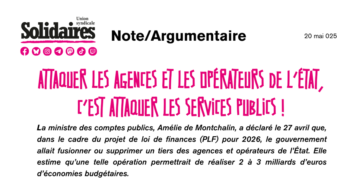 Le chiffrage de l’économie attendue ne repose par ailleurs sur rien, aucun élément n’a été avancé, le projet du gouvernement restant en réalité inconnu. En outre, certains propos de la ministre sont particulièrement choquants et vexatoires, notamment lorsqu’elle avance qu’il faut « supprimer ce qui est inutile ou ce qui coûte trop cher », ce qui sous-entend que les missions exercées par les salarié·es de ces agences et opérateurs ne servent à rien et que elles et eux-mêmes coûtent trop cher.