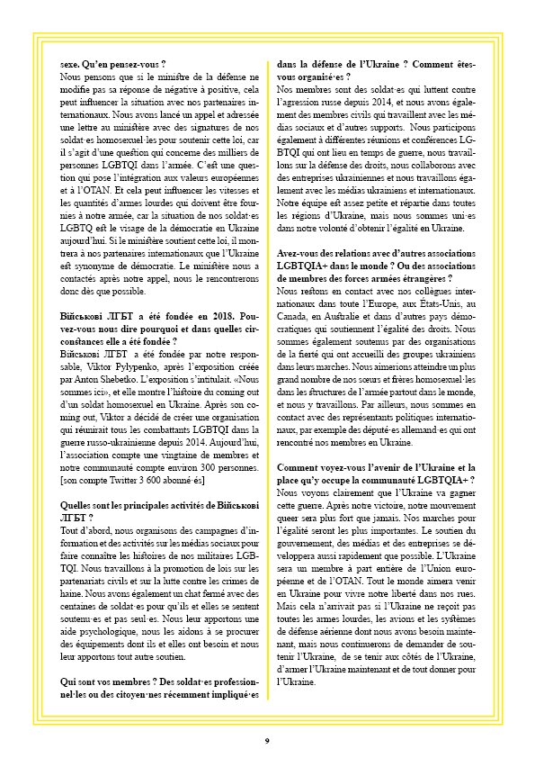 Le problème le plus important pour les soldat·es homosexuel·es est l'absence de loi soutenant le partenariat civil [ou mariage] en Ukraine. Dans cette situation, nos soldat·es homosexuel·les ne peuvent pas bénéficier des mêmes droits que leurs collègues hétérosexuel·les dans l'armée. Il s'agit du droit de rendre visite à son partenaire à l'hôpital ou d'avoir un héritage si l'un·e des partenaires meurt sur un champ de bataille et d'autres droits civils tout aussi nécessaires. Nous demandons donc à notre gouvernement d'adopter une loi sur les partenariats civils, afin de protéger les soldat·es qui protègent l'Ukraine.