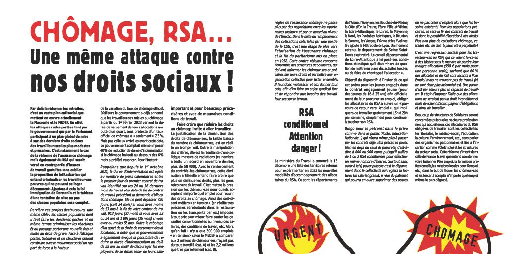 Beaucoup de structures de Solidaires seront concernées puisque les secteurs professionnels qui accueilleront ces allocataires du RSA obligé-e-s de travailler sont les collectivités territoriales, le médico-social, l’éducation, la Culture, l’environnement, etc…, sans parler des organismes gestionnaires et liés à l’insertion comme Pôle Emploi et les structures du secteur social. Cette réforme s’inscrit dans celle de France Travail qui entend coordonner voire fusionner Pôle Emploi, la formation professionnelle, les missions locales pour l’emploi, etc…, dans le but de fliquer les chômeurs-ses et les forcer à accepter n’importe quel emploi même le plus dégradé.