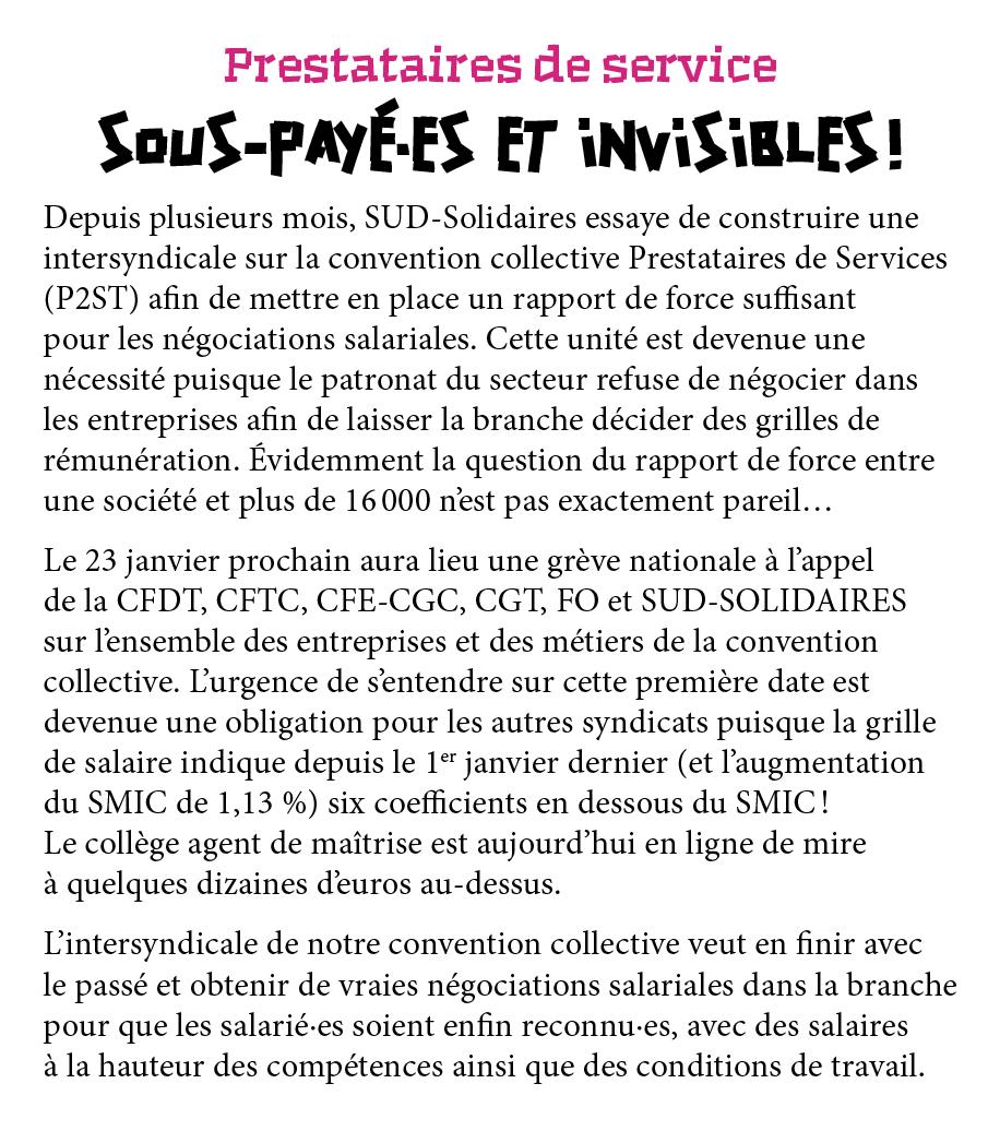Depuis plusieurs mois, SUD-Solidaires essaye de construire une intersyndicale sur la convention collective Prestataires de Services (P2ST) afin de mettre en place un rapport de force suffisant pour les négociations salariales. Cette unité est devenue une nécessité puisque le patronat du secteur refuse de négocier dans les entreprises afin de laisser la branche décider des grilles de rémunération. Évidemment la question du rapport de force entre une société et plus de 16 000 n’est pas exactement pareil…