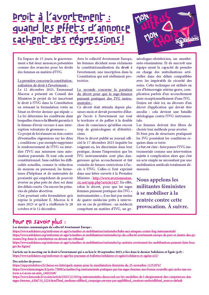 L’article sur le meeting sur le droit à l’avortement qui a eu lieu le 30 septembre 2023, à lire dans le dernier Solidaires et Egale (p.8) :
